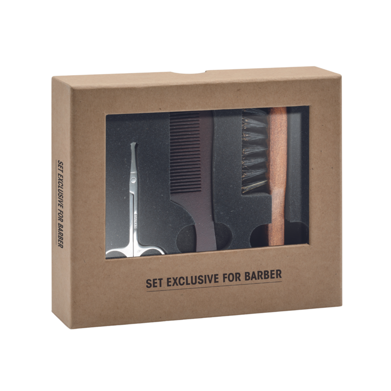 Il Set Barber per la cura della barba è il kit completo per una barba sempre perfetta. Al suo interno troverai una pratica forbicina per barba e baffi, ideale per i ritocchi quotidiani, una spazzolina che districa e modella con delicatezza, e un pettine che permette di sistemare i baffi e la barba con precisione. Perfetto per chi desidera una cura professionale della barba direttamente a casa