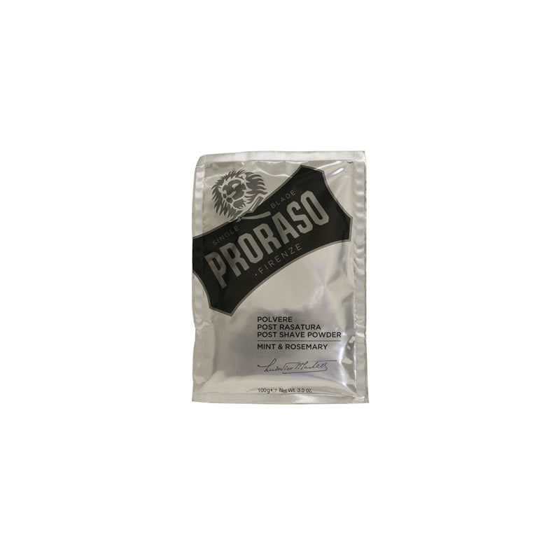 Dal 1948 Proraso lavora con orgoglio e passione al fianco dei professionisti della rasatura. Da questa collaborazione nascono i prodotti Single Blade pensati per l'eccellanza nella rasatura professionale e la mano esperta dei barbieri.Polvere Post Rasatura: dopo la rasatura una passata di polvere assorbe l'umidità in eccesso, rende la pelle liscia e asciutta, riduce il rischio di irritazioni e arrossamenti, Mint e Rosemary: menta e bergamotto conducono a note di garofano, rosmarino e vetyver per una sensazione di morbidezza e freschezza.Confezione:1 busta da 100 gr.